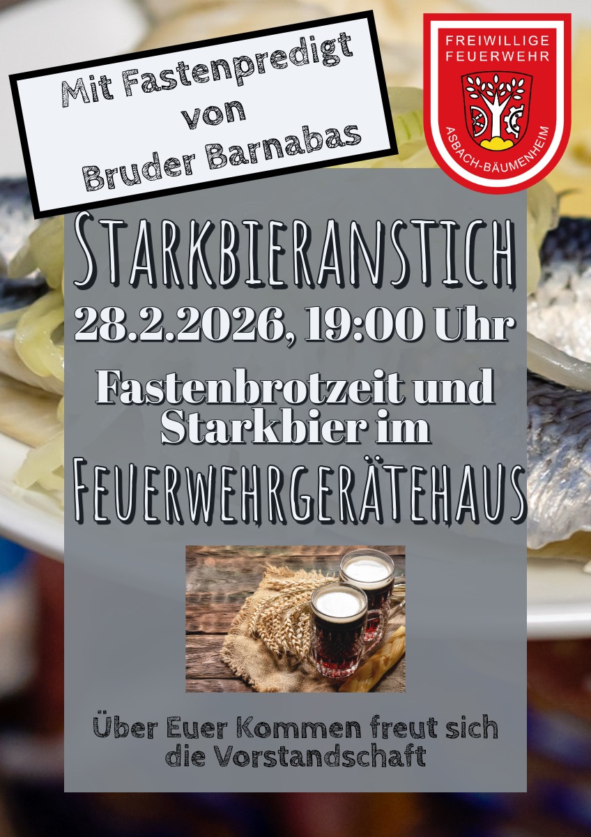 Am Samstag, 28. Februar 2026 um 19.00 Uhr findet wieder unser traditioneller Starkbieranstich im Feuerwehrhaus statt. Bruder Barnabas Julian Bumberger wird in gehabt strenger und süffisanter Manier über die aktuellen Geschehnisse richten.